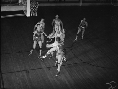 The Texas Christian University (T. C. U.) basketball team is facing off against North Texas State Teachers College Eagles (N. T. S. T. C.). The tall frog, in white shirt with hands on ball is L. A. Monroe. His teammate Buddy Barron is directly behind him. The other Frog is Floppy Blackman (number 33). The Eagles on defense are Vandal Green (number 21) and Bill Menefee (number 20).