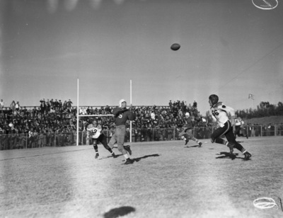 The bi-district schoolboy classic is being held in Witchita Falls, Texas. Competing in the high school football game are the Lubbock Westerners (white jerseys) and the Wichita Falls Coyotes. The Hill-to-Smith combination was working all afternoon for the Coyotes. R. D. Smith (5) is shown looking back to catch a pass from Gene Hill. The football is being threaded between two approaching Lubbock defenders - Robert Brewer (12) and Franklin Butler (66). Smith caught the pass on the ten-yard line and charged across the goal line for the final touchdown. Wichita Falls downed Lubbock 30-13. An audience is seated in the stands and a pipe goalpost is in view. The players are wearing leather helmets. "(Star-Telegram Photos by Wilburn Davis.)" Published Star-Telegram Morn. Dec. 7, 1941.