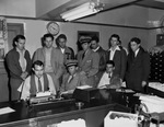 Flier line up for indentification cards. Standing, left to right, Davis Lee, student flier; Jordan Jones, instructor; Jack Odle, student, and Dan Reese, instructor. (3 boys at right are not identified). Seated, left to right, T. S. Wall, indentification clerk; glenn Edds, instructor; and Howard Johnson, Nacogdoches, student.