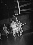 The Texas Christian University Horned Frogs (T. C. U.) are facing off against the commercial basketball team in Dallas, Texas. Frog Nick Broom (number 30) is shown ringing two points with a neat under-the-basket shot in the first half. The tall player vainly reaching for the ball is Dallas' Ned Flowers. The Frog with his back to the camera is Bob Balaban (number 32).