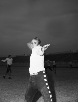 The Ysleta High School football team of El Paso, Texas, is one of the teams competing in the State Quarterfinals. They will face off against Wichita Falls High School on Saturday. In preparation for the game, Roger Smith is practicing throwing the ball to his receivers. Smith, who has a fine record on the season, will do a majority of the passing for Ysleta. The five students in view are practicing in an empty stadium. "(Star-Telegram Photo.)" Published Star-Telegram Eve. Dec. 13, 1941.