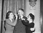 Here is a scene of the Beta Alpha Rho annual bosses' banquet. R. E. Cox having his false mustache adjusted by Miss Ruth Carter (left) and Miss Janice Johnson at the banquet. The two women stand on either side of Mr. Cox while he places his arms around them. Miss Johnson and Miss Carter hold on to both sides of the mustache as all three smile and laugh. Mr. Cox is wearing a double-breasted suit and tie and eyeglasses. Both Miss Carter and Miss Johnson are wearing long-sleeved dresses. Miss Johnson also has a flower pinned near her dress collar. Miss Carter is one of Mr. Cox's employees. The mustache was part of the party decorations and was similar to those each guest was required to wear. The sorority furnished them. Published in the Fort Worth Star-Telegram morning edition, December 12, 1941.