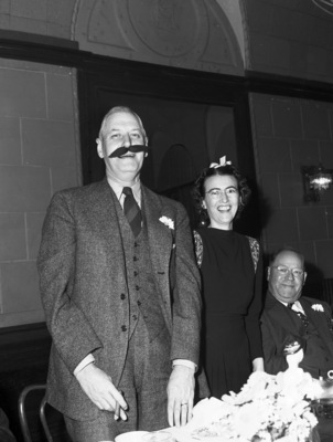 Beta Alpha Rho, Young Women's Christian Association (YWCA) business girls club is celebrating annual bosses' banquet. Agnes Britt and her boss, William Rigg are pictured here. Miss Britt and Mr. Rigg are shown standing beside each other, both smiling widely at the camera. In front of them is a table with a flower arrangement. Mr. Rigg is wearing a textured suit with a striped tie and fake mustache on his face and holding a cigar in his right hand. Miss Britt is wearing a dark, long-sleeved dress with a pair of eyeglasses and a bow in her hair. Sitting next to Miss Britt is an unidentified man who is also smiling at the camera. Published in the Fort Worth Star-Telegram morning edition, December 28, 1941.