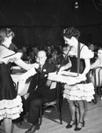 Beta Alpha Rho, Young Women's Christian Association (YWCA) business girls club is celebrating annual bosses' banquet. Attendees Postmaster Henry Young (seated), Miss Terris Bender (left), receptionist in a local photograph studio; and Miss Vivian Huddle, Civil Aeronautics Administration employee, are pictured here. Mr. Young gets a cigar and a light from Miss Bender and Miss Huddle grins at his crooked mustache. Mr. Young is dressed in a dark suit and wearing a fake mustache while Misses Bender and Huddle are wearing matching ruffle dresses and holding small boxes that are slung around their necks. Other seated attendees are in the banquet room. Published in the Fort Worth Star-Telegram morning edition, December 28, 1941.