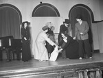 Beta Alpha Rho, Young Women's Christian Association (YWCA) business girls club is celebrating annual bosses' banquet. The girls passed out cigars, staged a "Melodrammer" and sang the old songs to entertain their guests. A middle of the scene is pictured here. A group of women are shown up on a stage, dressed in costumes. A couple of the women are dressed up as men in suits with fake mustaches while the other performers are wearing long-sleeved dresses and head coverings. They are, from left to right, the hero, Virginia Stoddard; the heroine, Pet Patrick; the villain, Ruth Cohen; Ma, Ina Mae Johnson; detek-a-tif, Mildred Toliver, and woman of mystery, Faye Chiles. Published in the Fort Worth Star-Telegram morning edition, December 28, 1941.