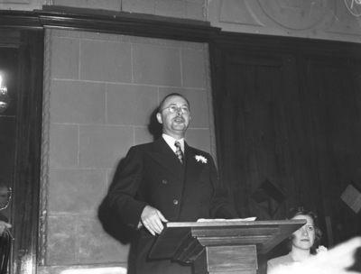 Beta Alpha Rho, Young Women's Christian Association (YWCA) business girls club is celebrating annual bosses' banquet. Boyce House, speaker and author is pictured here. Mr. House is shown standing at a podium in and speaking to the audience. He is wearing a dark, double-breasted suit and tie and a pair of eyeglasses. There is an unidentified woman seated next to the podium. Mr. House was the only guest on the program.