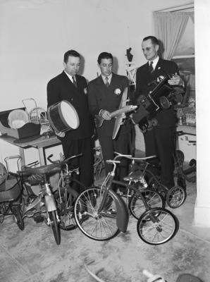 East Fort Worth Lions Club member, left to right, Elmo Reeves holding a drum, Leonard Sandlin holding an airplane and Harrell Ashburn holding a train, looking at toys they have collected during their "toy day" luncheon. They are standing next to each other with tricycles in front of them and other toys behind on tables. The toys will be distributed to East Side youngsters for Christmas. Published by the Fort Worth Star-Telegram evening edition, December 12, 1941.