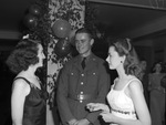 Private Ralph Moody, center, a Camp Wolters soldier, is introduced to Miss Claudine Rogers, left, by Miss Patricia Winn, right, a Texas Christian University student, at the United Service Organization (U. S. O.) Christmas soldier dance at Hotel Texas. Private Moody is wearing his military uniform. Miss Rogers and Miss Winn are both wearing sleeveless dresses with thin shoulder straps; Miss Rogers' dress is a darker color than Miss Winn's.