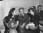 Private Roy Mattoon, of Hammond, Indiana (center), Mary Deaver (left) and Marjorie Cotner take a break from dancing at the United Service Organization Christmas soldier dance at Hotel Texas. They are sitting in chairs. An unidentified soldier is sitting at the far right, in the background. Private Mattoon is wearing his military uniform. Miss Deaver and Miss Cotner are wearing dresses and are each holding a balloon.