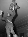 Sam Batista, of Cleveland, Ohio, is being hoisted up by fellow guests so he can reach a bundle of balloons that have floated to the ceiling of the ballroom at Hotel Texas during the United Service Organization (U. S. O.) Christmas soldier dance. He is wearing his military uniform.