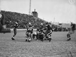 The high school state semifinals game is being played in Dallas, Texas. Battling to advance to the championship game are the Wichita Falls Coyotes (solid jerseys) and the Sunset Dallas Bison. In the second quarter of the game, Coyote quarterback Gene Hill (2) faked a pass before making a counter on a two-yard cutback. He is shown lunging for the end zone with the ball cradled in his right arm. Attempting to make the tackle are Sunset defenders Welch (40), Hays (25), and Hall (38). Wichita Falls went on to win the game 14-0 to advance to the state championship. The stands are filled with spectators and there are onlookers at the edge of the field of play. "(Star-Telegram Photos by Tommy Dillard.)" Published Star-Telegram Morn.. Dec. 14, 1941.