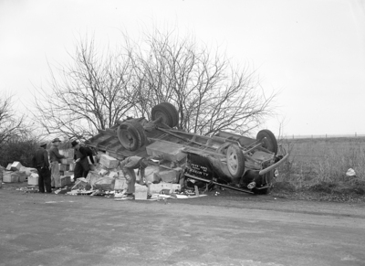 Image shows Eggs valued at $1,500 were destroyed when this truck overturned at Twelfth Street and Samuels Avenue. The driver was O. R. Frazier, who was treated for minor injuries by a physician. The truck, operated by the Market Produce Company, was loaded with 225 cases of eggs, two-thirds of which were broken. The entire load was valued at $2,200. A group of people are standing around the truck, observing the damage. Published in the Fort Worth Star-Telegram evening edition December 15, 1941.