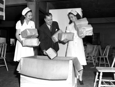 Red Cross workers. Walter L. Douning, publicity chairman for Red Cross war fund in Fort Worth, Texas, center. At left is Miss Emma Moyar and Miss Sue Harding, right.