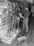 Camp Wolters in Mineral Wells, Texas is preparing for Christmas and a big celebration. Left to right are Major Leif Neprud and Major Walter R. Lynn. They are inspecting a Turkey sample, making sure all the Christmas food is ready in cold storage. Major Neprud is a field ration subsistence officer while Major Lynn is a camp mess officer. Both men are dressed in their military uniforms.