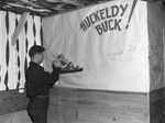 Camp Wolters in Mineral Wells, Texas is preparing for Christmas and a big celebration. Private Thomas Sweenie is a Chicago, Illinois commercial artist in civilian life. He is applying his talent to a blank mess hall wall where he is painting Santa Claus in a sleigh pulled by reindeer. He is wearing a button-up shirt and jeans. Published in the Fort Worth Star-Telegram morning edition, December 21, 1941