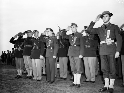 Three hundred and seventeen soldiers ranked with the general at Camp Bowie Saturday as the all-Texas 36th Division marched in review as climax to its three days of training tests. The review was in honor of the winning soldiers in 55 contests which tried the military skills acquired by the division in its year of training. Only the enlisted men, the best from each regiment, competed in the various events. Three enlisted soldiers ranked with General Walker are pictured here. From left to right, are Brigadier General (Brig. Gen.) Robert O. Whiteaker, , Brigadier General (Brig. Gen.) Preston A. Weatherred, General Walker and Sergeant (Sergt.) Jack A. Jamieson. Sergeant (Sergt.) Jamieson, Kingsville, Texas, received the best position for the review. The officers are dressed in uniforms and standing at a salute. Published in the Fort Worth Star-Telegram morning edition, December 21, 1941.