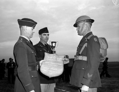 Three hundred and seventeen soldiers ranked with the general at Camp Bowie Saturday as the all-Texas 36th Division marched in review as climax to its three days of training tests. The review was in honor of the winning soldiers in 55 contests which tried the military skills acquired by the division in its year of training. Only the enlisted men, the best from each regiment, competed in the various events. The 111th Engineers win two main trophies.. In this scene Brigadier General Fred L. Walker, left, presents plaque to Lieutenant Colonel Floyd E. Martin of the Engineers while Major Joheph B. McShane (rear center) waits to hand over the loving cup. The Engineers get the cup, too. Published in the Fort Worth Star-Telegram morning edition, December 21, 1941.