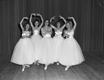 Fort Worth Recreation Department Christmas program at Will Rogers Memorial Auditorium. Left to right, Betty Maloy, Jane Huffman, Helen Grubbs, Joy Maloy and Alice Tomlin. The women are wearing matching dresses and performing ballet. Star-Telegram Evening, December 23, 1941.