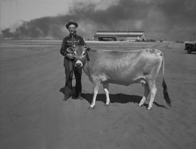 Shown here in the picture are T. G. Fullick, Odessa, with his attractive Jersey Heifer, Patsy. She was the only Jersey exhibited at the Sand Hills Stock show at Odessa.