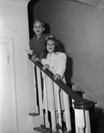 Christmas scenes. Ogden K. Shannon III, 8, and Glenn Shannon, 6. They are shown standing on a staircase holding on to the banister. They are dressed in robes and pajamas. Published in the Fort Worth Star-Telegram Morning Edition, December 25 1941.