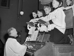 Christmas scenes. Organist William J. Marsh and choir boys from Saint Patrick's Church: left to right, Bernard Smith, Joseph Hall, Charles Benzon and Joseph Schumacher. Mr. Marsh is sitting in the front of the organ, playing it, while the boys kneel on the organ itself in front of him. Published in the Fort Worth Star-Telegram Morning Edition, December 25 1941.