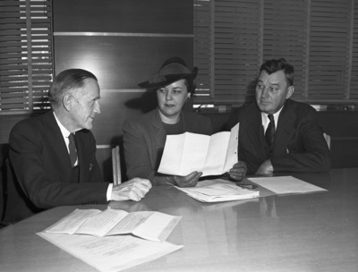 Miss Dorothy de la Pole, San Antonio, Texas, representative of 8th Regional Office of Civil Defense, (center) Joe B. Hogsett (left) and Aubrey Alexander.