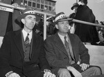 The High School Football State Championship game is being held at Farrington Field in Fort Worth, Texas. A crowd of 18,000 are on hand to witness the battle between the Wichita Falls Coyotes and the Temple Wildcats. Attending the game, left to right, are Conrad Vernon and Leslie Huff. Mr. Vernon is the principal of Temple High School. He is wearing a hat with a Temple ribbon, striped shirt, patterned tie, three-piece suit, and a coat. Mr. Huff is a school board member. He is dressed in a hat with a Temple ribbon, striped shirt, dotted tie, three-piece tweed suit, and a tweed coat. Neither man has missed a Temple game in years. "(Star-Telegram Photo.)" Published Star-Telegram Morn. Dec. 28, 1941.