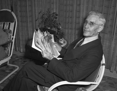 W. T. Ladd is recalling a horseback ride from fifty years earlier. He rode from Dallas to Fort Worth, Texas and got a job as a dairy hand. He rose from that job to become one of the city's best known and loved business men. On the anniversary of his move to Fort Worth, Mr. Ladd was showered with letters from his old friends and grateful townsmen. He is sitting on a chair with the letters fanned out. He is dressed in a suit. Published in The Fort Worth Star-Telegram Evening Edition December 29, 1941.
