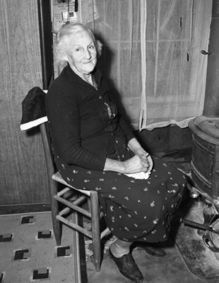 Mrs. Willie L. Stewart, 77, of Lake Worth, had a vision that came true. Despite a message from the Navy Department that her foster son was killed in action, she believed that he was alive. A second message stated that Carl Stewart, the foster son, was alive. Mrs. Stewart is sitting in a chair in front of a wood-burning stove. She is holding a light-colored handkerchief. Published in the Fort Worth Star-Telegram evening edition, December 29, 1941.