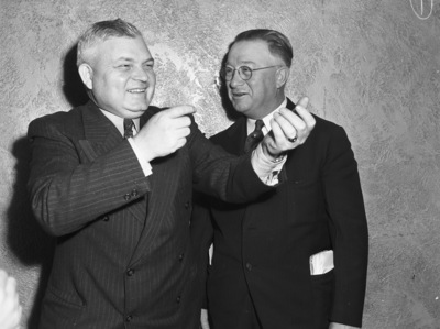 These arrivals for the annual Salesman's Banquet Tuesday night at Hotel Texas are good examples of the brand of enthusiasm 600 salesmen will bring to the gathering. At left, Otho Jones, of Redfield, South Dakota, is telling Milt Withers of Fort Worth about his latest pheasant hunt in South Dakota. Withers is vice president in charge of sales for Globe Laboratories and Jones is the firm's representative in the South Dakota area. Mr. Jones is pantomiming the act of shooting a gun for Mr. Withers. Published in the Fort Worth Star-Telegram evening edition, December 30, 1941.