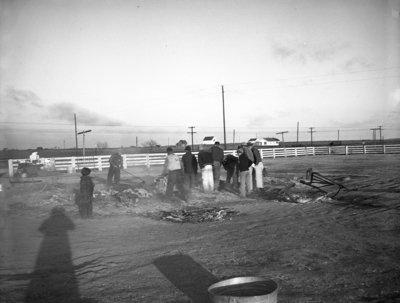 Image shows A Fire in a Texas and Pacific Railway section house in Watauga, Texas took the lives of a father and four of his children. Killed in the fire were Augustine Abila thirty-eight; Alberta - eighteen; Delores - fifteen; Raymond - thirteen, and Daniel - eleven. Mr. Abila rose at 4 a.m. to light a fire in the stove when an explosion occurred and the Abila living quarters were ablaze. The neighboring family - Epefeno Guererro, his wife, and five children heard the explosion and made it to safety. Mr. Guererro busted through the Abila's door with an axe and managed to rescue Mr. Abila's wife, his brother John Abila, and a baby Carmen. A group of people are standing next the smoldering ruins.