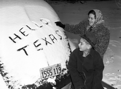 The blanket of white that covered almost everything Saturday morning was like a message from home for the Henry Whitts at 1535 Pulaski Street. They came here two weeks ago from Champaign, Illinois. Whitt, a sheet metal worker, is employed at the Lake Worth bomber assembly plant. Mrs. Whitt and Henry Junior, 14, are shown by their car. Mrs. Whitt and young Henry are smiling and looking at their car which is covered in snow. Mrs. Whitt is pointing to a message declaring "Hello Texas" drawn by finger in all capital letters in the snow. Just below the message is a 1941 Illinois license plate reading "1555 119". Published in the Fort Worth Star-Telegram evening edition, January 3, 1942.