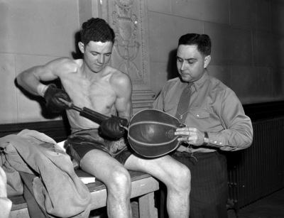 Amateur boxers from all around the area are preparing for the 1942 Golden Gloves District Tournament in Fort Worth, Texas. Preparing for the tournament are, left to right, Hugh Conde and Woodie Taylor. Mr. Conde is one of the foremost challengers for the vacant middleweight championship. In 1941 he lost the division to Andy Eagleton, who went on to win the state title. Mr. Taylor is an instructor at the Golden Gloves gym. He is dressed in a button-up shirt, necktie, and striped trousers. Mr. Taylor and Mr. Conde are shown inflating a punching bag.
