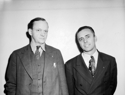 Public installation of officers of the International Order of Odd Fellows (I. O. O. F.) will be held Tuesday night at Lodge Number 318 Hall, 307 1/2 West First Street. Forrest Stephens (right) will be installed as noble grand and I. L. Hood as vice grand of Lodge Number 1003. E. B. Hulmes (not pictured) will be installed as noble grand and L. M. Crockett (not pictured) as vice grand of Lodge Number 318. A floor show will be given. Mr. Stephens is wearing a pinstripe double-breasted suit and a tie with a rosette pattern. His arms are his back, and his head is cocking to his right as he is looking directly at the camera. Mr. Hood is wearing a three-piece suit. His tie has a fish scale pattern. His head is turned slightly to his left, nevertheless he is looking directly into the camera with an expressionless face. Published in the Fort Worth Star-Telegram morning edition, January 6, 1942.