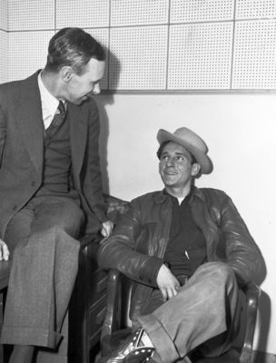 Jimmy Leroy Pennick, 20, of Denver City, right, smiles at C. M. Furneaux, assistant cashier of the Sudan National Bank, which Pennick admitted robbing Monday of $5,489. Furneaux identified Pennick as one of two men who held him up at gun point. Mr. Furneaux is sitting on a desk and looking down at Mr. Pennick, who is sitting in an office chair. Both men are crossing their legs, although Mr. Pennick has a slightly wider stance. Mr. Pennick is resting his elbows on the arms of the chair, with his hands grazing his lap. Mr. Furneaux is holding an edge of the desk with one hand and rest his other hand on the desk. Published in the Fort Worth Star-Telegram evening edition, January 7, 1942.