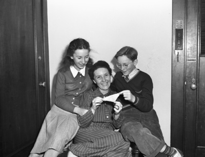 Mrs. Clarence E. Voegeli and children, Virginia, left, and Fred, right holding a piece of Japanese parachute forming a V-shaped souvenir from Pearl Harbor. The whole family is smiling big smiles. Mrs. Voegeli is seated with Virginia and Fred sitting on the arm rest and looking at the scrap with interest. Published in the Fort Worth Star-Telegram morning edition, January 7, 1942.