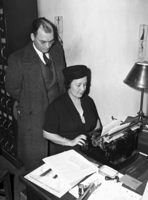 Grady Gray applying for Tarrant County's January ration of new automobile tires. Mrs. Frank O. Sims is sitting at a desk with a typewriter, assisting with the application, while Mr. Gray stands behind her. A number of papers and a lamp are also on the table while a filing cabinet is against the wall behind Mr. Grady. Mr. Grady is wearing a suit and tie while Mrs. Sims is wearing dark colored dress and hat. Published in the Fort Worth Star-Telegram evening edition, January 6 1942.