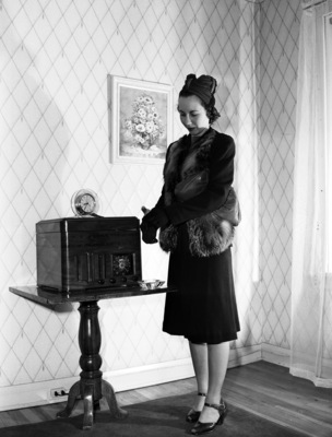 When the career wife changes costume and career, time and plans must be well organized, Mrs. Paul Daniels, 1216 Pennsylvania Avenue, has learned. The bride is a young business woman, with a clock to check her routine, as she pulls on her gloves, the final step before crossing the threshold from home to the business world. Mrs. Daniels is standing beside a table, on which a clock, radio, and ashtray are resting. There is a still life painting of flowers hanging on the wall. The walls are covered in an elegant diamond-patterned wallpaper. Sheer curtains are hanging on the window behind her. Mrs. Daniels is wearing a long-sleeved dress, a fur vest, and a turban. She is pressing her purse into her side while pulling on her gloves. Published in the Fort Worth Star-Telegram morning edition, January 18, 1942.