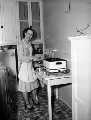 When the career wife changes costume and career, time and plans must be well organized, Mrs. Paul Daniels, 1216 Pennsylvania Avenue, has learned. Mrs. Daniels, the former Miss Elsa Cashion who was married December 12, presents a trim picture in her house dress and apron as she prepares a whole meal in an electric cooker." Mrs. Daniels is standing in her kitchen in front of an electric cooker. In addition to the electric cooker, there is a small pot, an onion, what appear to be carrots, some potatoes, and a couple of apples resting on the table. To her left, kitchen towels are hanging. A toaster is peeking out from a shelf. There are two appliances, one just behind her and one at her 7 o'clock position, that appear to be iceboxes. The flooring is covered by a rectangular stone pattern, which may be printed on linoleum. Mrs. Daniels smiles and looks at the camera as she is peeling what appears to be a potato. Published in the Fort Worth Star-Telegram morning edition, January 18, 1942.
