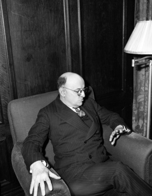 He'll See That the President Gets Those Extra Warplanes. Tom M. Girdler, board chairman of Vultee Aircraft, Incorporated, and Consolidated Aircraft Corporation. "The President wants more planes. He's going to get them, that's all. I'm going to be as helpful as I can." Mr. Girdler is shown seated, wearing a double-breasted and striped three-piece suit, along with a light-colored button-up shirt and a tie. He is peering down at his hand, which is making a gesture away from the arm of the chair. Published in The Fort Worth Star-Telegram Evening Edition January 9, 1942.