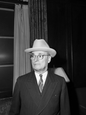 Tom M. Girdler, board chairman of Vultee Aircraft, Incorporated, and Consolidated Aircraft Corporation. "In a new role as plane maker, Tom M. Girdler, recently-elected board chairman of Vultee Aircraft, Inc., and Consolidated Aircraft Corporation, will inspect the Lake Worth bomber plant Friday. Previously he has been best known as chairman of Republic Steel Corporation. He is shown here after settling a Shady Oak hat on his head at the Fort Worth Club." Mr. Girdler is wearing a double-breasted and striped three-piece suit, along with a light-colored button-up shirt, a tie, and a Shady Oak hat. Published in The Fort Worth Star-Telegram Morning Edition January 9, 1942.