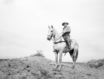 An unidentified cowboy riding a horse. He's wearing a cowboy hat, long sleeve shirt, trousers, and cowboy boots. He's looking in the direction of the photographer.