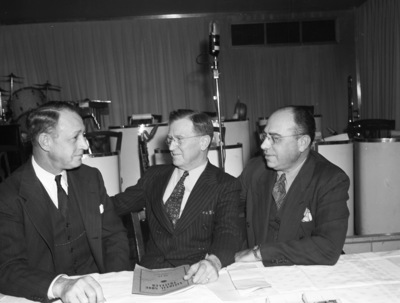 Southwestern Shoe Travelers Association Convention. Shown are convention attendees J. C. Simmons of Dallas, right, A. E. Allen, Dallas, left, and Dave L. Tandy, center, of Fort Worth. The men are all seated, wearing suits, and sitting at a table engaged in conversation. The convention was held at the Hotel Texas. Behind them, a stage is filled with drums, a microphone, and various instruments. Star-Telegram Morning, January 12 1942.