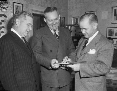John B. Collier Junior, right, buying a Texas League box seat at LaGrave Field from Rogers Hornsby, center, Fort Worth Cats manager, and Henry Love. All three men are wearing suits. Mr. Collier Junior appears to be signing off on his box seat in a small booklet that Mr. Horsnby is holding up for him. The men are standing in a room that is decorated with a variety of framed photographs hanging on the walls.