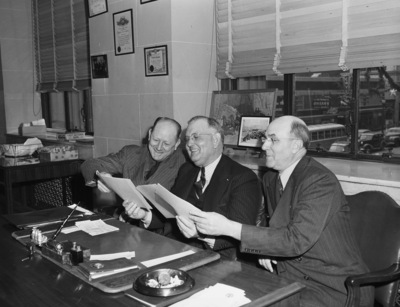 Defense bond buying was instituted as a regular part of the year's program last week for Moslah Temple Shrine directors, one of the Shrine's uniformed bodies, and officers are shown examining their first purchase. The directors plan to buy bonds periodically out of their surplus funds. Left to right, R. E. Lee, president, Champ Clark, assistant rabban, and L. O. Hulsey, secretary treasurer, are sitting behind a desk, looking at their purchased bonds. The men are sitting in a large room with two large windows behind them. Books and paintings sit on the windowsills. Clark is vice president of the First National Bank, where the bonds were purchased. Star-Telegram Evening, January 12 1942. Published in The Fort Worth Star-Telegram Evening Edition January 12, 1942.