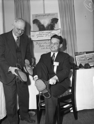 Texas-Southwest Shoe Retailers Association Convention at Hotel Texas. Troy Duncan, sitting in a chair and putting on shoe-boot that is standard footwear in the Russian army as J. L. Sullivan stands beside him and compares its size with an ordinary shoe. Both men are wearing suits. Behind them, posters hang advertising the shoes. Published in The Fort Worth Star-Telegram Morning Edition January 12, 1942.