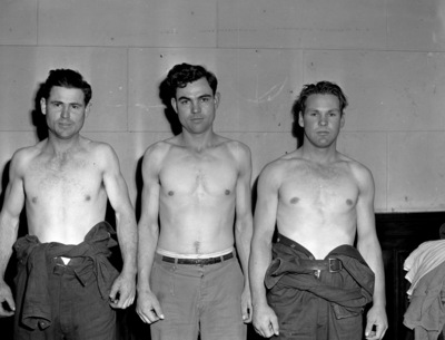 Amateur boxers from all around the area are preparing for the 1942 Golden Gloves District Tournament in Fort Worth, Texas. Three of the latest and biggest entries in the tournament, left to right, are Jasper Peugh, Howard Jewett, and James Townson. All three men are employees of Merchants Cold Storage Company. Peugh and Townson are light heavyweights and Jewett is a heavyweight.