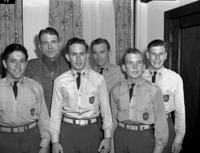 Amateur boxers from all around the area are preparing for the 1942 Golden Gloves District Tournament in Fort Worth, Texas. Students from Allen Academy are competing in the tournament. They are, left to right, Dick Menchaca, Coach Angus Stocking, Mitchell Dorsey, Leonard Leudtke, Weldon Wyatt, and Alvin Ellison. Coach Stocking is dressed in a suit while the boys are wearing their uniforms. Menchaca is a two-time national bantam champion, but will now compete as a featherweight.