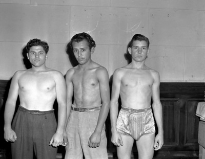 Amateur boxers from all around the area are preparing for the 1942 Golden Gloves District Tournament in Fort Worth, Texas. Among the new challengers competing in the tournament, left to right, are Theodash Theos and Jesse Longonia. An unidentified boxer is standing at the right, wearing shorts. Theos and Longonia are wearing trousers. All three boys are shirtless.