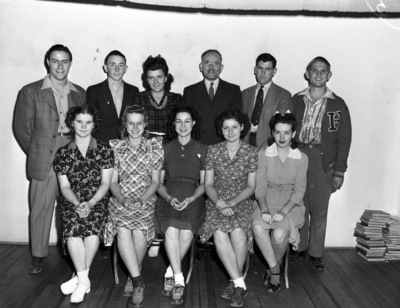 The senior students who are graduating in January 1942 from Handley High School pose for a group picture, with 5 students sitting and the rest standing behind them. There are at least 10 students pictured, the third man standing from the right appears to be a faculty member. There are two stacks of books on the right. Published in the Fort Worth Star-Telegram evening edition, January 15, 1942.